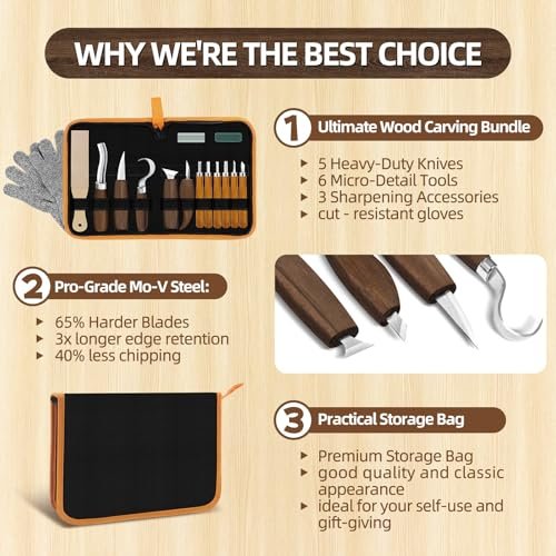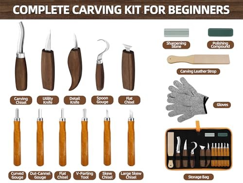 Beginner’s Wood Carving Tools Set: 16-Piece Kit with Whittling and Detail Knives, Deluxe Spoon Carving Tools, Includes Carry Bag – Perfect for Adult Woodworking Hobbies Under $70