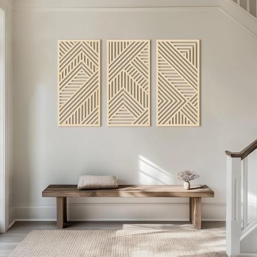 BINCUE Boho Wood Wall Art – 3-Panel 3D Hollow Design for Kitchen, Bathroom, Living Room, and Office Decor – Lightweight Hanging Decor Under $70