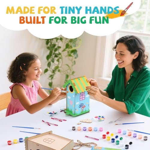 - All-Inclusive Kit: Each birdhouse comes with 12 vibrant paint colors, brushes, a palette, a wind chime set, and easy-to-follow instructions.