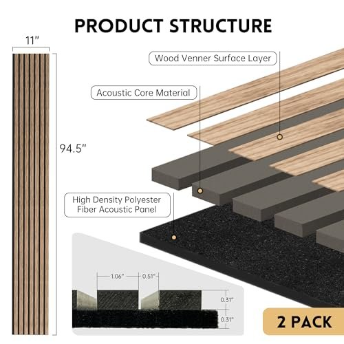 RITOLLO Wood Slat Acoustic Wall Panels – 2-Piece Set, 94.5″ x 11″, Natural Walnut Finish