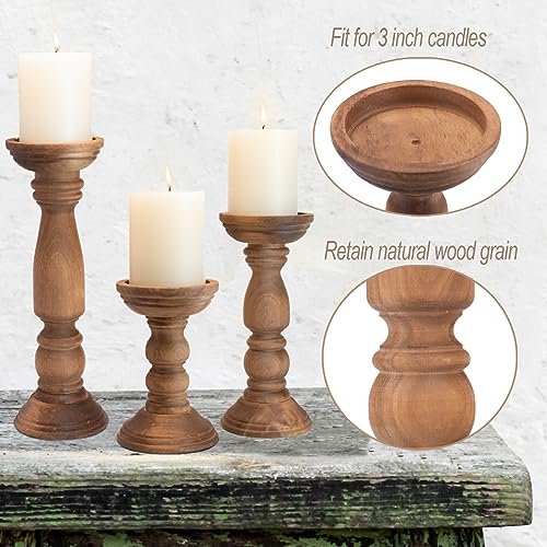 Rustic Farmhouse Wooden Candle Holders Set of 3 for Pillar Candles – Vintage Brown Table Centerpiece Decor (12”, 9”, 6”)