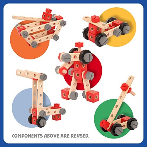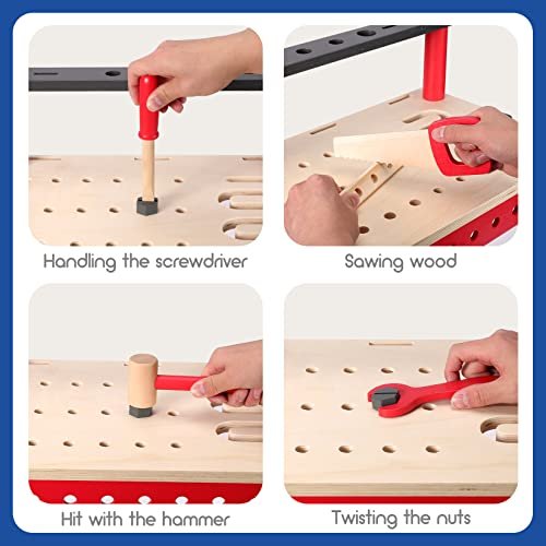 - Comprehensive Kit: Includes 37 wooden nuts and bolts, 27 workbench pieces, and essential woodworking tools like a wooden wrench, screwdriver, saw, hammer, electric drill, and rule.